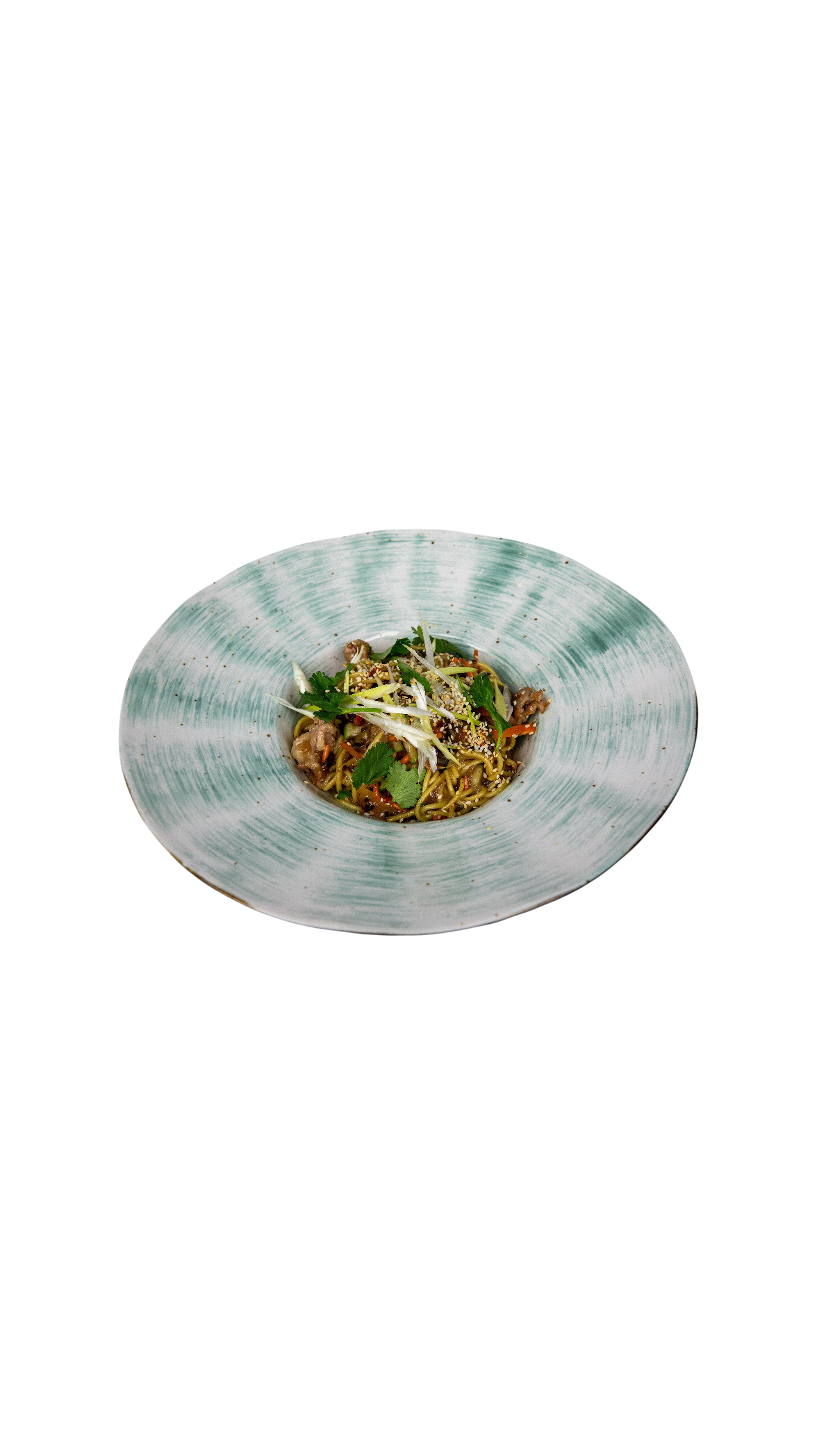 Удон, микс Азия, свинина, рыбный соус, соус по-азиатски, кинза, зеленый лук, кунжут.
